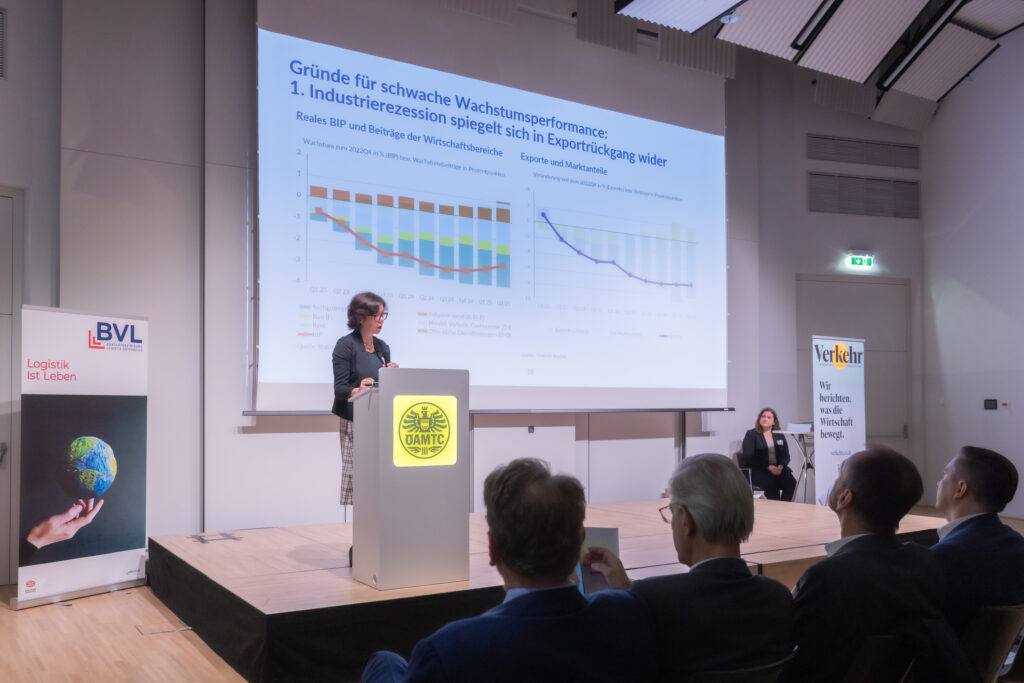 Birgit Niessner, Senior Research Associate am Wiener Institut für Internationale Wirtschaftsvergleiche (wiiw), analysierte in ihrer Keynote die aktuelle wirtschaftliche Lage Österreichs. „Österreich schleppt sich aus der Rezession“, so Niessner. Das BIP-Wachstum bleibe verhalten, die Inflationsrate liege heuer bei 3,5 Prozent und soll 2026 auf 2,6 Prozent sinken. Hohe Löhne im EU-Vergleich dämpften die Wettbewerbsfähigkeit. Ihre Empfehlung an die Logistikbranche: Resilienz stärken, Mitarbeiterbindung intensivieren, Digitalisierung vorantreiben – besonders in kleinen und mittleren Unternehmen. Wer den Anschluss bei KI verpasst, verliere im Wettbewerb, warnte Niessner.
