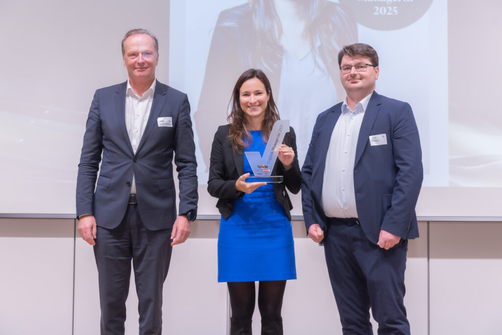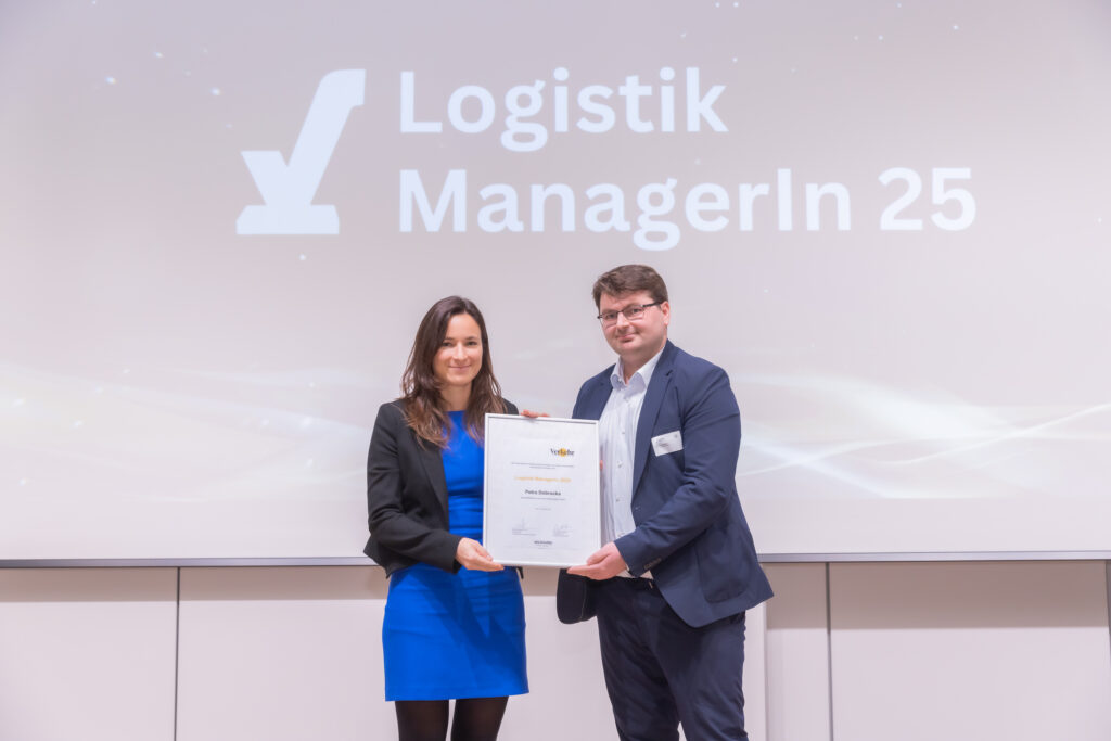 Zur Logistik-Managerin des Jahres wählten die Leserinnen und Leser sowie der Fachbeirat der Wochenzeitung Verkehr Petra Dobrocka, COO und Mitbegründerin des Logistikdienstleisters byrd. Die Auszeichnung ging damit an eine Expertin, die eine Logistikplattform entwickelt und führt, die mit technologischen Ansätzen den Online-Handel effizienter machen will. Die Trophäe in Form eines stilisierten „V“ aus geschliffenem Glas nahm Dobrocka sichtlich überrascht und mit einem zufriedenen Lächeln entgegen.