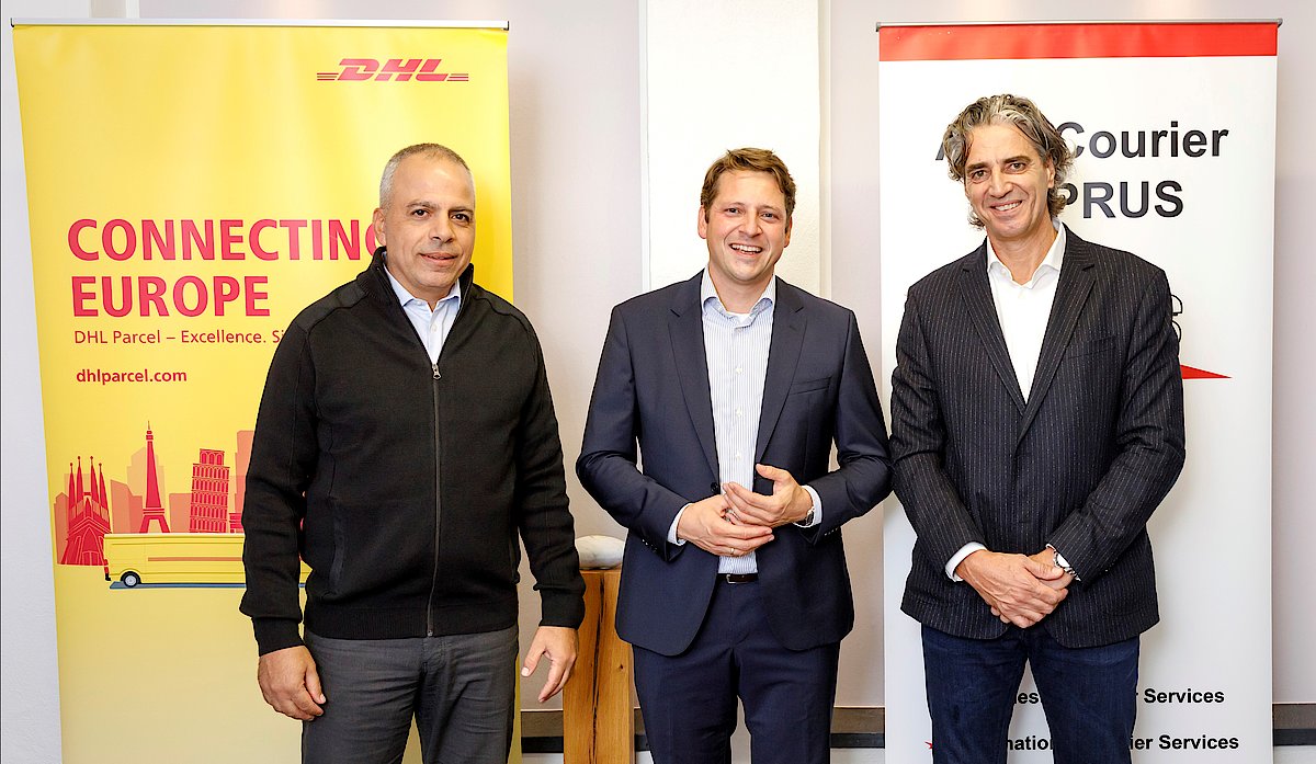 (v.l.n.r.) Christoforos Potamitis (Managing Director ACS Air Courier Services Cyprus), Alexander Schmitz-Hübsch (Vice President Product Management Connect, DHL eCommerce Solutions), Alkis Matsis (CEO ACS Air Courier Services Cyprus).