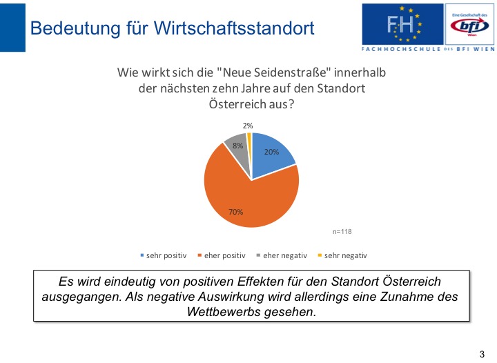 Von den Befragten gehen 90 Prozent davon aus, dass die "Neue Seidenstraße" einen positiven Effekt über die nächsten zehn Jahre auf den Standort Österreich haben wird. 20 Prozent der Befragten sehen sogar sehr positive Effekte. Nur jeder Zehnte sieht negative oder sehr negative Auswirkungen. Die am meisten genannte negative Auswirkung ist die Zunahme des Wettbewerbs. Nicht ganz überraschend, werden die mit Abstand positivsten Auswirkungen im Bereich Schiene erwartet. 88 Prozent der Befragten sehen die Bahnverkehre zu den Gewinnern der "Neuen Seidenstraße". An zweiter Stelle folgt die Kontraktlogistik mit 73 Prozent. Erwartungsgemäß sind die Erwartungen für die Seefracht gedämpfter (63 Prozent), ähnlich wie für die Luftfracht (68 Prozent). Am wenigsten wird in den nächsten zehn Jahren der Straßenverkehr als Gewinner der "Neuen Seidenstraße" prognostiziert. Nur etwa 32 Prozent sehen die Entwicklung auf der Straße sehr positiv und 35 Prozent eher positiv.