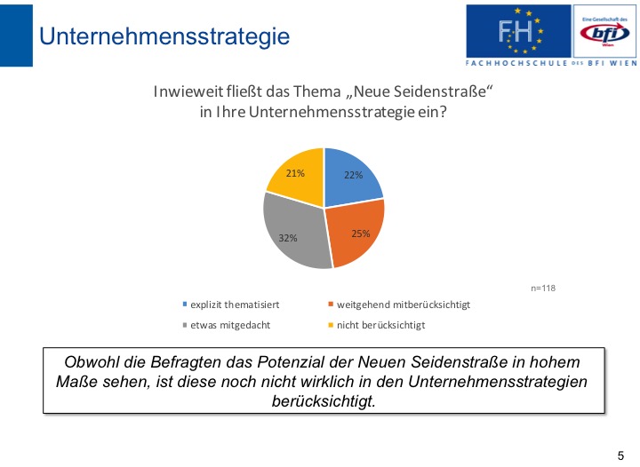 Obwohl die Befragten das Potenzial der "Neuen Seidenstraße" in hohem Maße sehen, ist diese noch nicht wirklich in der Unternehmensstrategie berücksichtigt. Nur 22 Prozent geben an, dass die "Neue Seidenstraße" in der Strategie explizit berücksichtigt wurde. Tatsächlich ist aber bei der Mehrheit der Befragten die "Neuen Seidenstraße" kaum ein strategisches Thema.